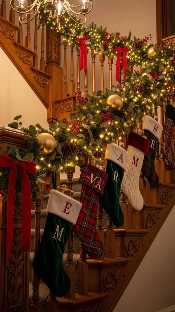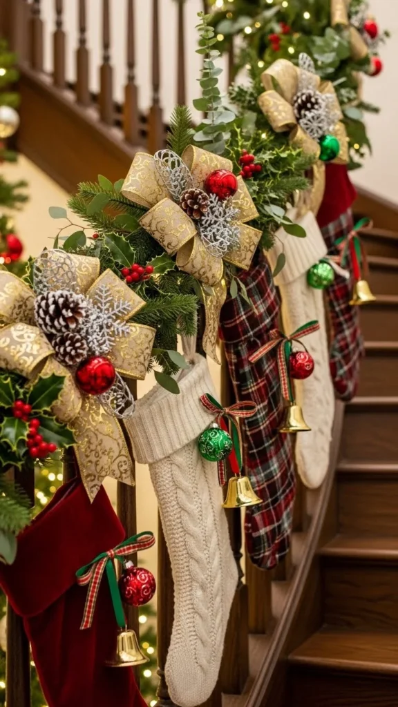Hanging stockings on a stair railing isn’t just practical—it’s a chance to create a magical, designer-level moment in your home. With beautiful ribbon ties, lush garland, thoughtful spacing, and stylish accents, your staircase can become the Christmas centerpiece that guests gush over.