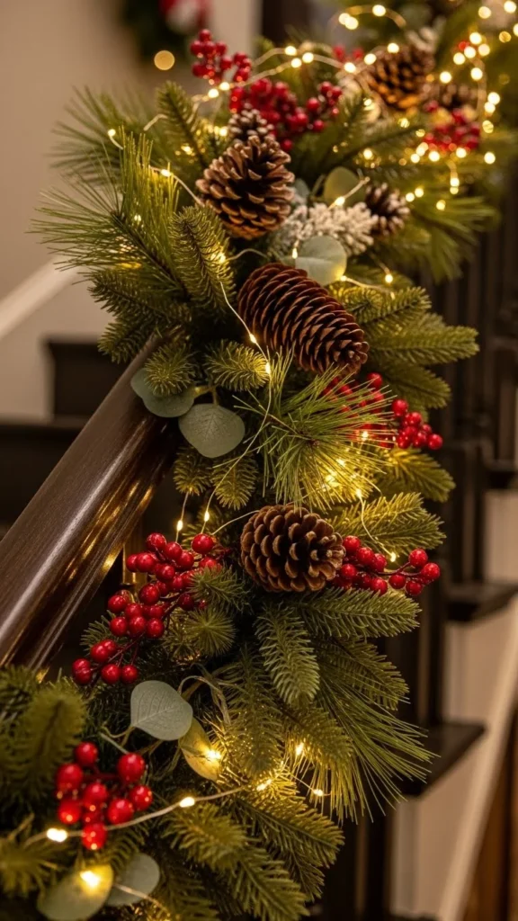 String warm LED fairy lights or micro-lights through the garland to give your railing that magical glow.