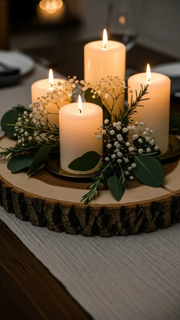 Wood and candles add warmth—literally and visually—and help elevate the centerpiece into something truly eye-catching.