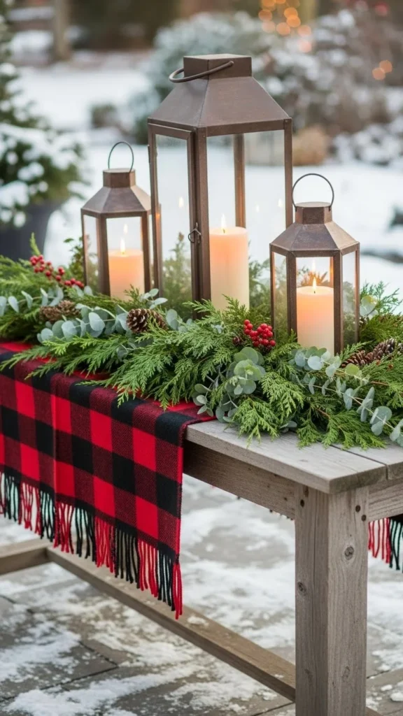 - Choose outdoor-safe decor elements like metal lanterns, evergreen garlands, and ceramic serveware.