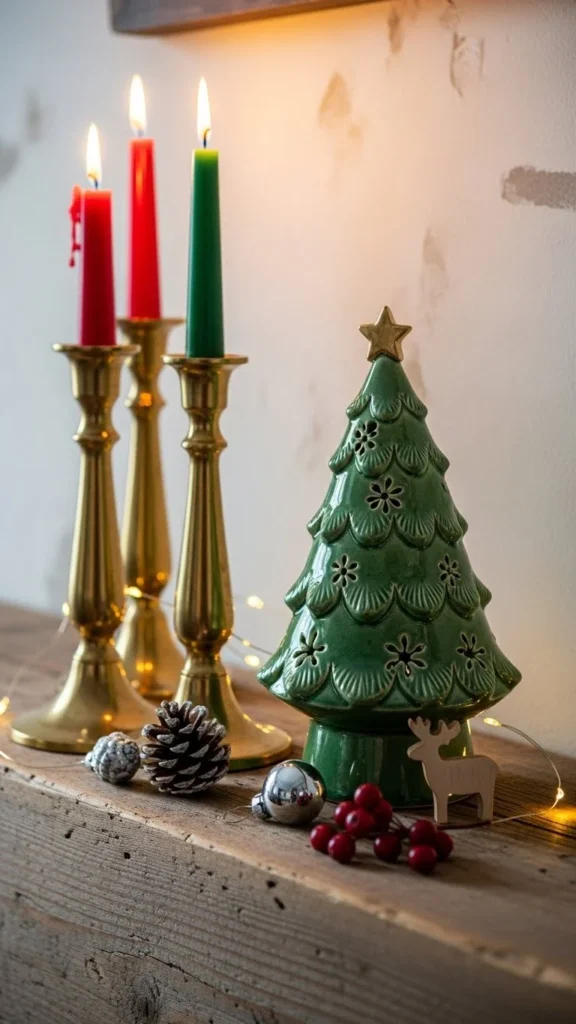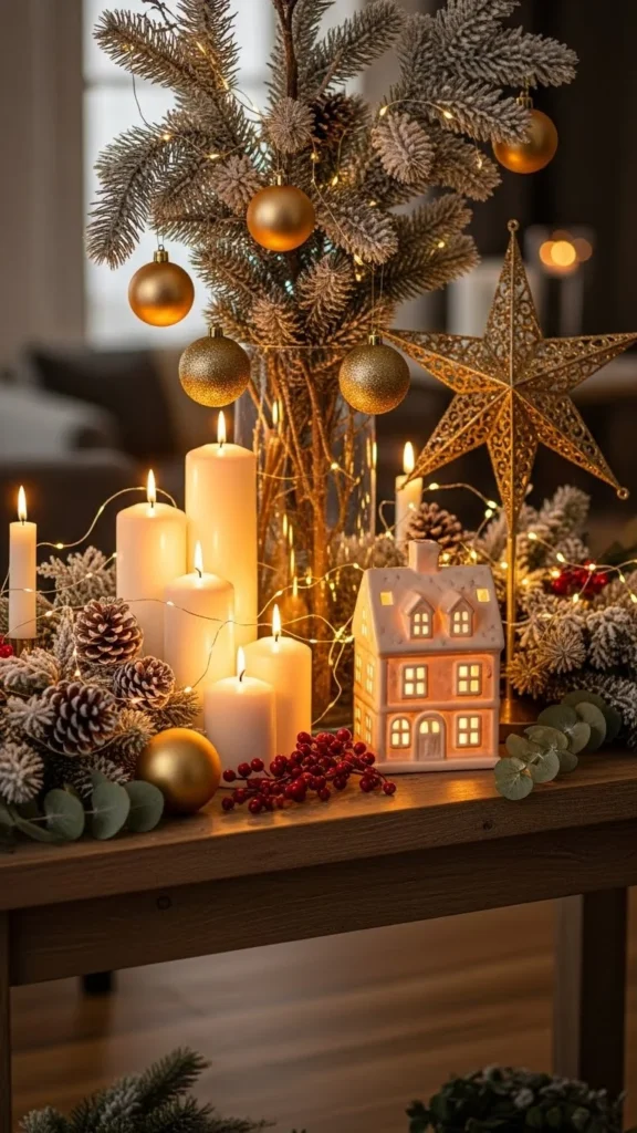 Christmas décor thrives on glow and shimmer. Your vignette will instantly look more luxurious with just one or two sparkling or lighted elements.