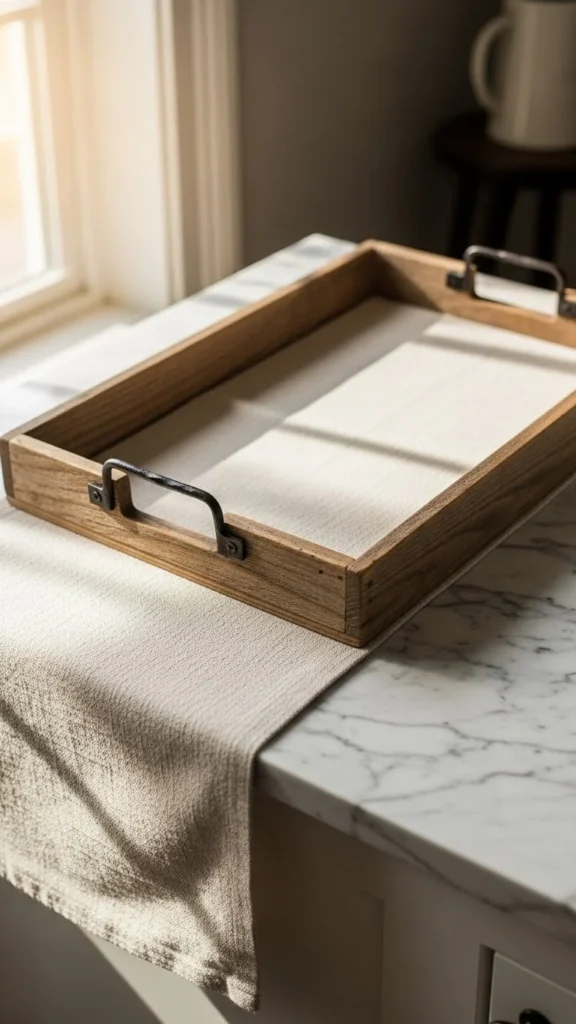 - Rustic farmhouse? Go for wood, burlap, or distressed trays.
