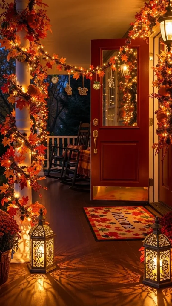 Use burlap ribbon, pinecone garland, and warm amber lights.