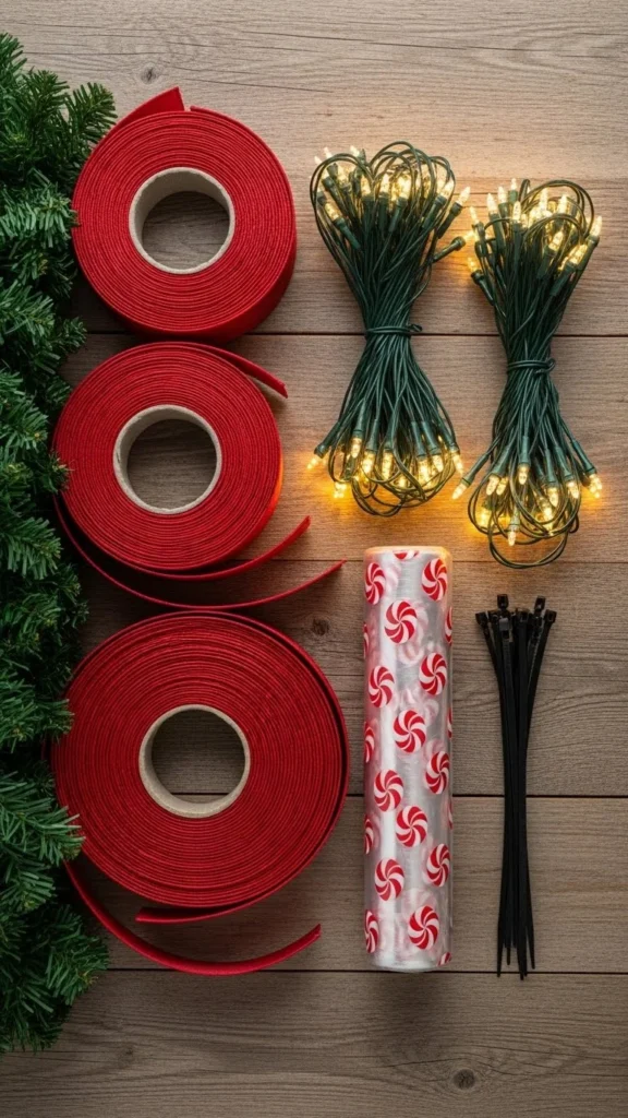 Use red ribbon, white lights, and a “North Pole” topper.