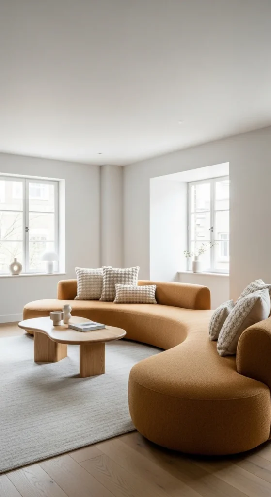 Curved seating works beautifully in compact apartments. Straight lines can feel rigid in tight rooms. Rounded shapes guide movement instead. A modular curved sofa lets you reconfigure layouts without heavy lifting. Choose warm neutral upholstery like oatmeal or greige to keep things light. Low backs prevent visual blockage, especially near windows.