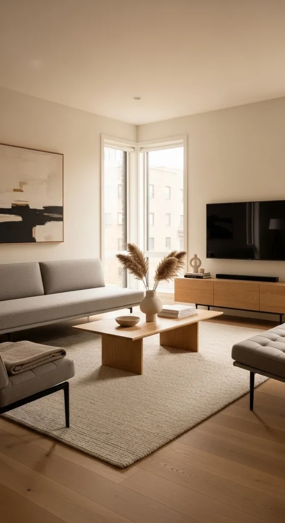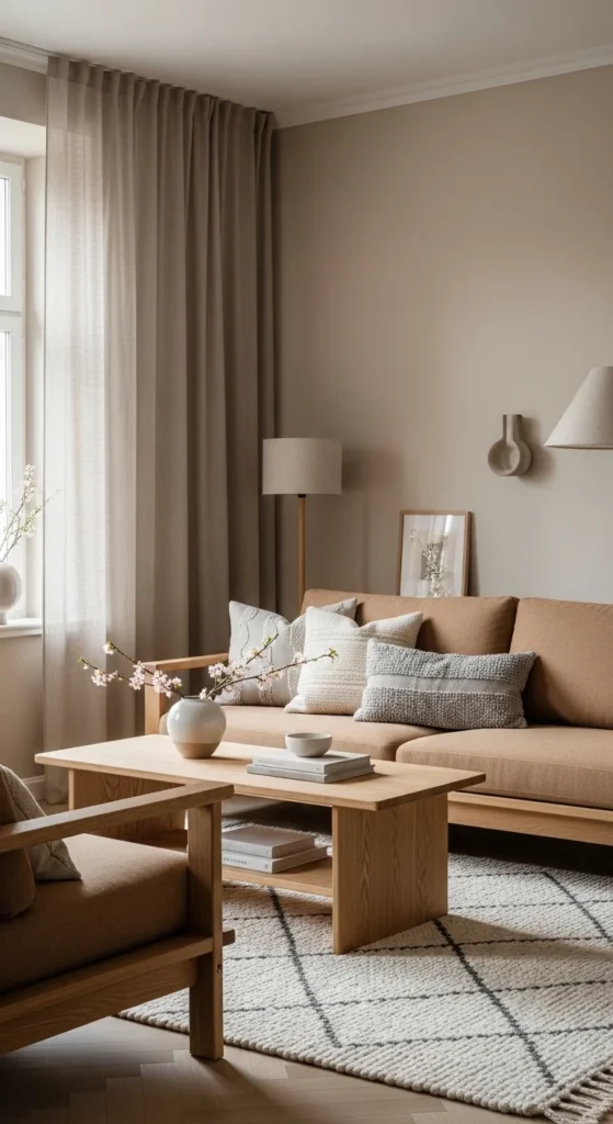 Natural wood sets the tone. Pair with soft fabrics like linen or cotton. Stick to beige, sand, and muted gray. Keep surfaces mostly clear.