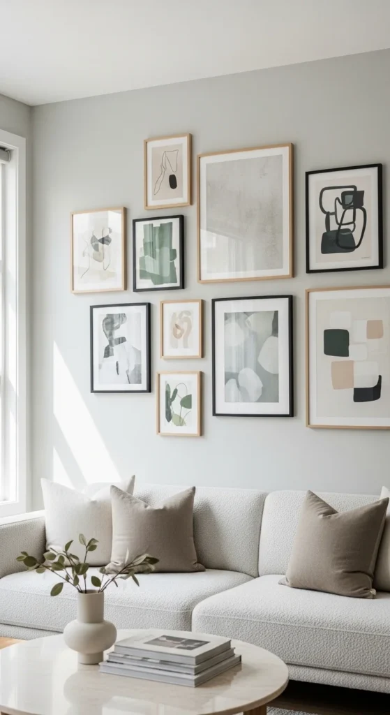 Neutral rooms can feel flat without personality. A gallery wall fixes that. Keep the palette tight. Black, oak, or white frames work best. Mix art sizes but align edges loosely for order.