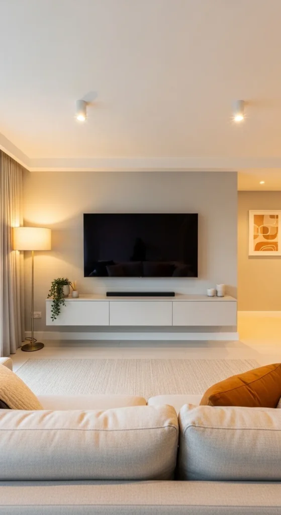 A low media console keeps the wall calm. Mount the TV slightly lower than usual for balance. Add one tall plant nearby to offset proportions. That contrast makes the room feel longer.