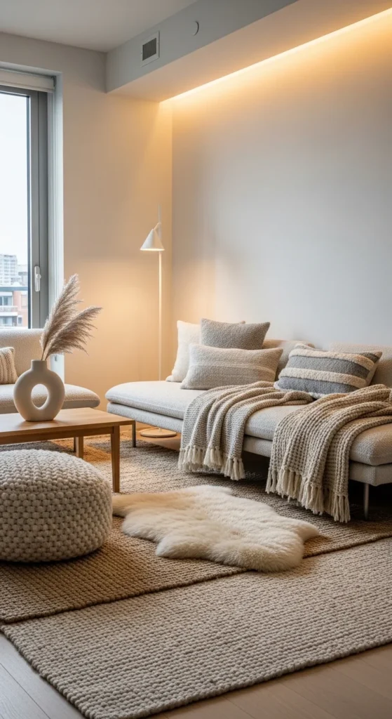 Boucle, wool, and linen pair well together. Keep colors restrained so textures stand out. One chunky throw adds comfort without noise.