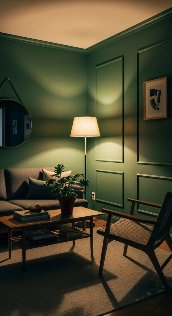 Dark walls can work in small apartments when done fully. Paint walls and trim the same color. That removes visual breaks. The room feels wrapped rather than chopped.