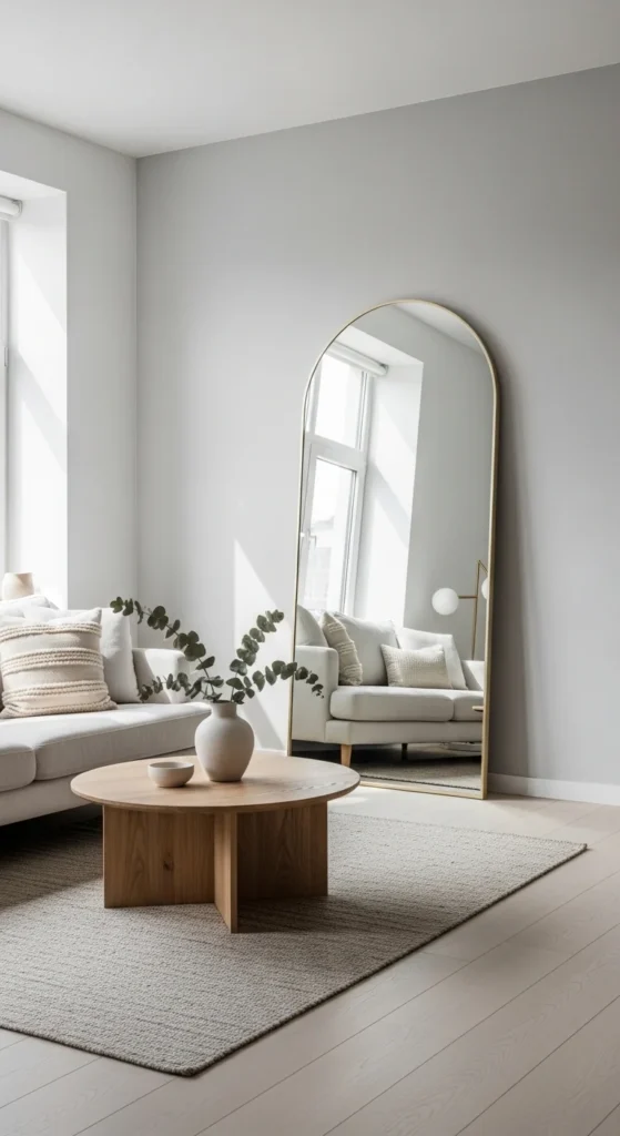 Large mirrors work better than clusters. One strong reflection feels intentional. Leaning styles are renter-safe and easy to move.