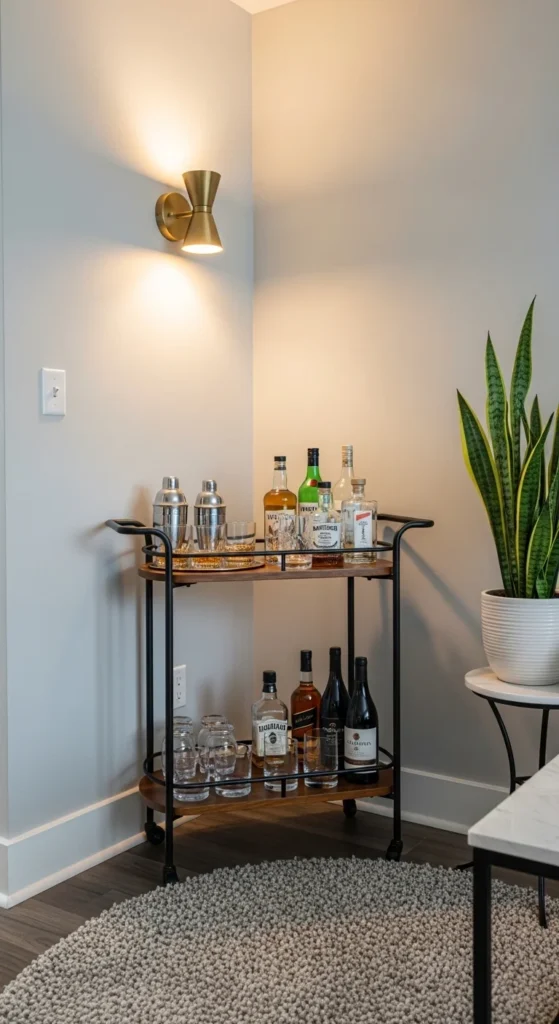 Entertaining doesn’t require a dining room. A slim bar cart or wall-mounted shelf works. Keep it narrow so walkways stay clear.