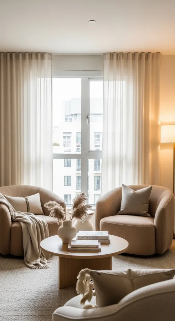 Stick to creams, sand, and soft taupe. Keep furniture shapes simple. Add one vintage-style lamp for warmth.