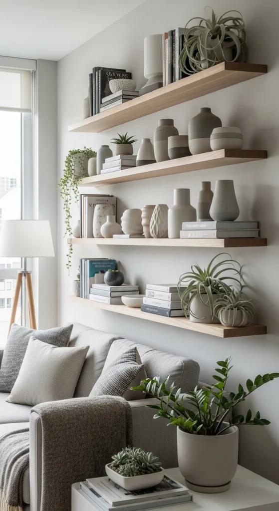 Floating shelves keep storage off the floor and walls visually light. Slim profiles work best. Paint them the same color as the wall to blend in. Use them sparingly so the room doesn’t feel busy.