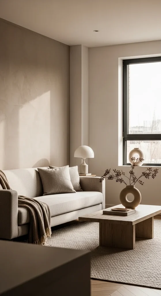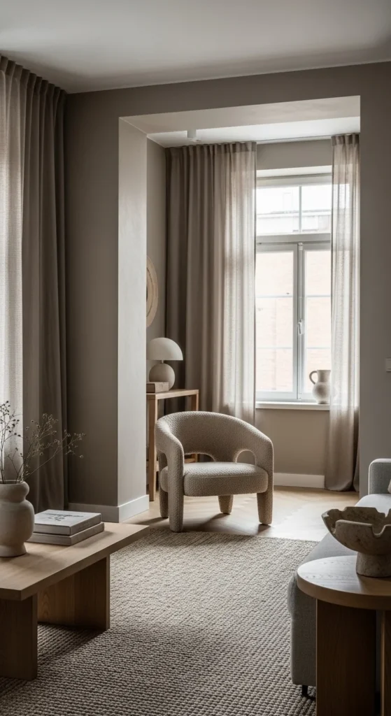 Walls in soft taupe or greige reflect light better than stark white. Add interest with fabric rather than pattern. A chunky rug grounds the space. Sheer curtains keep windows open visually. Use textural contrast instead of bold color.