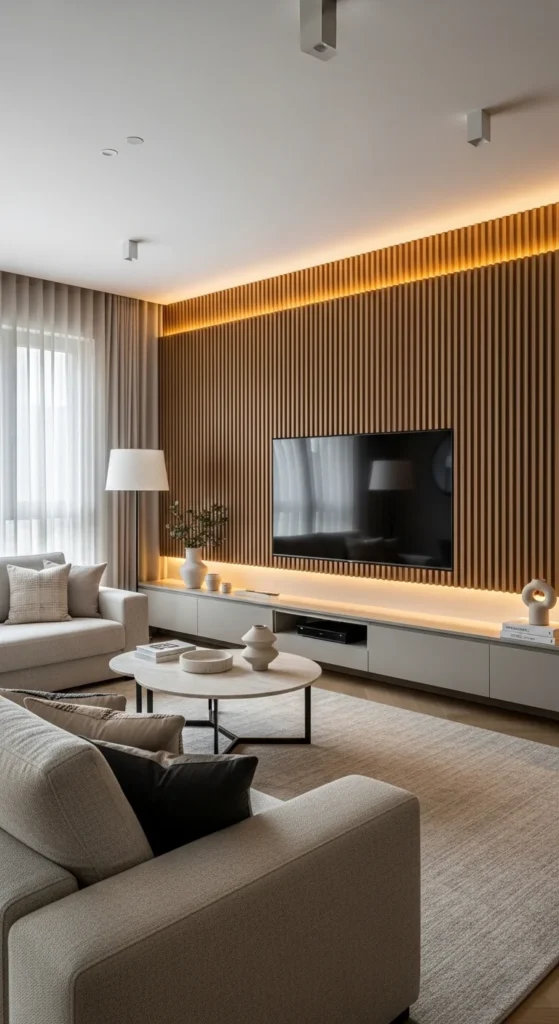 Fluted wood introduces rhythm and warmth. Vertical lines visually stretch walls upward. Use it behind the TV to turn a functional area into a focal point.
