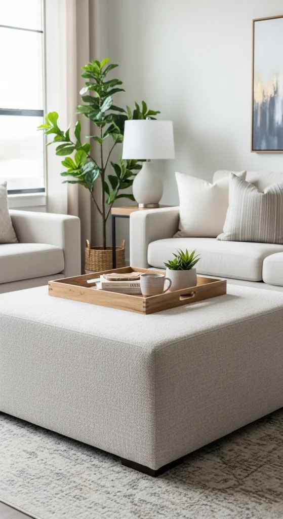Ottomans work harder than standard tables. They serve as seating, footrests, and surfaces. Add a tray to stabilize drinks or books.