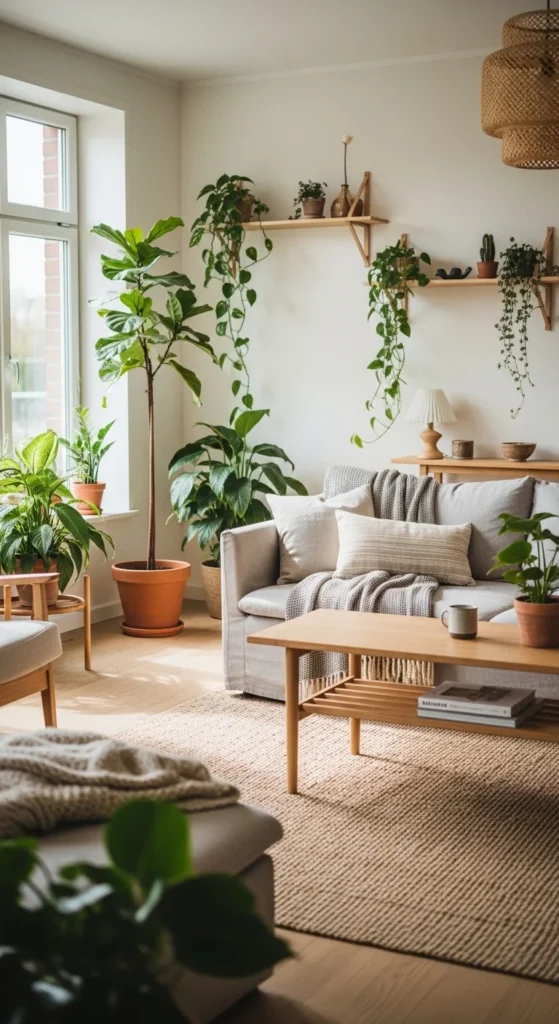 Natural materials reinforce the look. Wood trays. Stone coasters. Clay pots. Stick to a green-neutral balance so the room doesn’t feel busy. Use vertical shelves for trailing plants instead of floor pots.
