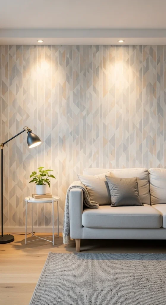 Textured looks like linen, plaster, or soft geometrics read well in modern spaces. Avoid glossy finishes. Matte surfaces feel calmer. Measure carefully and start from the center for alignment.