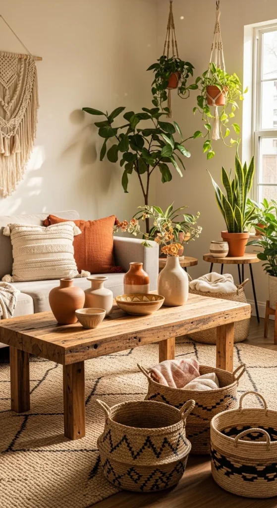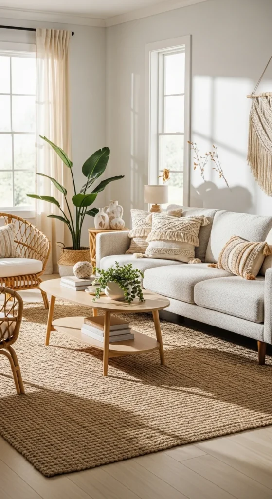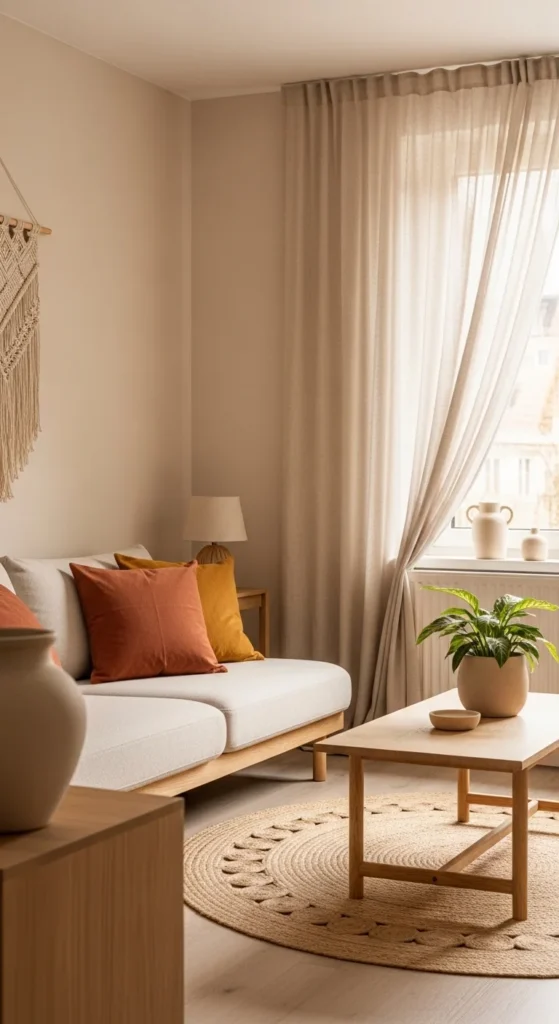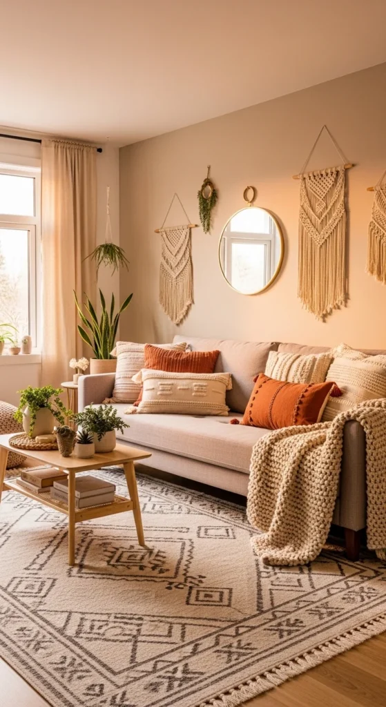 A neutral foundation sets the tone for modern boho spaces. Beige, warm white, or soft sand walls keep the room calm and open. Layer in earthy accents through pillows, ceramics, and small decor pieces. Terracotta, clay, and muted mustard work beautifully against pale backdrops. Stick to two accent colors max to avoid visual noise. Swap pillow covers seasonally instead of buying new furniture. That keeps costs down and the look flexible. Textures matter more than color count here. Linen, cotton, and lightly woven fabrics add softness without clutter. Choose a simple sofa with clean lines, then let accessories do the talking. Neutral bases paired with warm accents create balance between modern restraint and boho comfort. Keep surfaces breathable. Leave some negative space so every piece feels intentional.