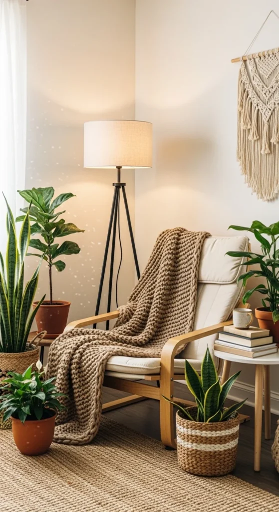A reading nook adds function without major layout changes. Choose a quiet corner near natural light. A comfortable chair matters more than size. Add a throw and one pillow for softness. Keep colors neutral so the nook blends into the room. A small side table holds books or tea. Floor lamps work better than overhead lights here. They create focus without glare. DIY tip: use a pouf instead of a table for flexible use. Textile layers make small corners feel intentional and lived-in. This setup also works well in apartments where space is limited. Keep the area simple so it stays inviting, not crowded.