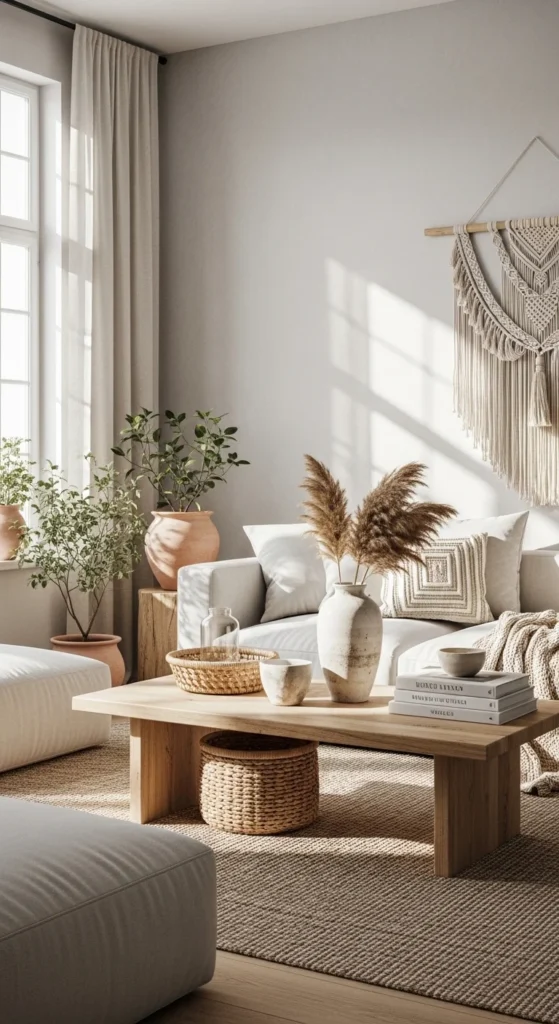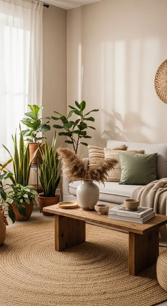 Indoor-outdoor styling blurs boundaries. Use natural materials that echo the outdoors. Pampas grass, branches, and clay vases work well. Sheer curtains let light move freely. Keep windows unobstructed when possible. This makes the room feel larger. Group natural decor in one or two areas instead of spreading it everywhere. Organic elements create visual continuity and a relaxed rhythm. Skip overly polished finishes. Slight imperfections add character. This approach works especially well in homes with good natural light.