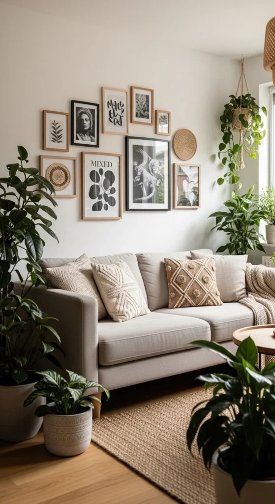 Gallery walls tell personal stories. Mix art, photography, and small textiles for texture. Keep a consistent color palette so the wall feels cohesive. Use kraft paper templates to plan layout before hanging. This avoids extra holes. Frames don’t need to match. Similar tones work better than identical styles. Include negative space so the wall can breathe. Curated gallery walls add personality without relying on bold furniture. Change pieces over time instead of adding more. This keeps the display intentional. For rentals, use adhesive hooks or ledges for flexibility.