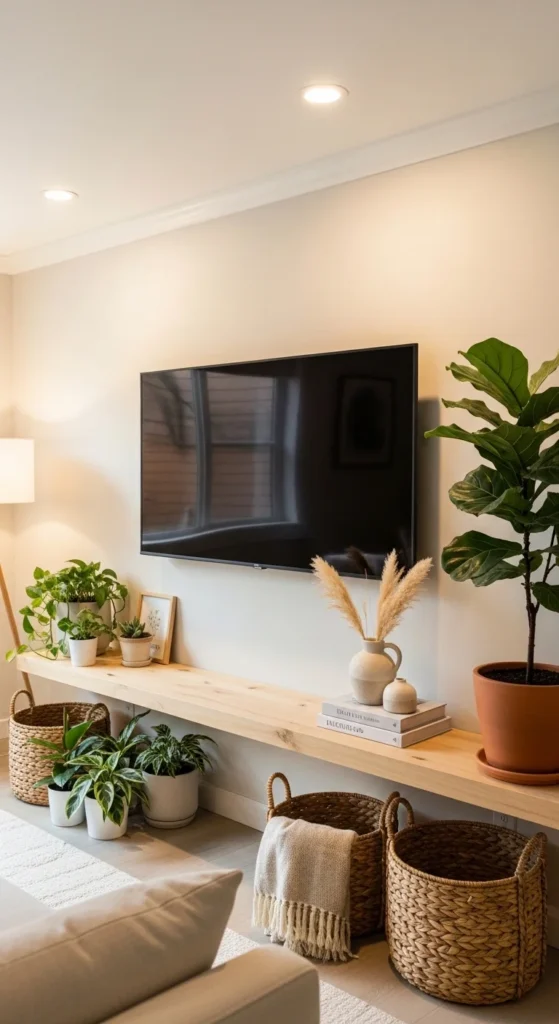 TV walls don’t have to feel cold. Use a low-profile console in wood tones. Add baskets or books underneath for warmth. Keep decor minimal so the screen doesn’t dominate. Plants on either side soften the edges. Wall-mounted TVs look cleaner and free up surface space. Boho TV styling blends function with warmth when clutter is controlled. Avoid gallery walls directly around the screen. They compete visually. Instead, style nearby shelves or corners to balance the area.