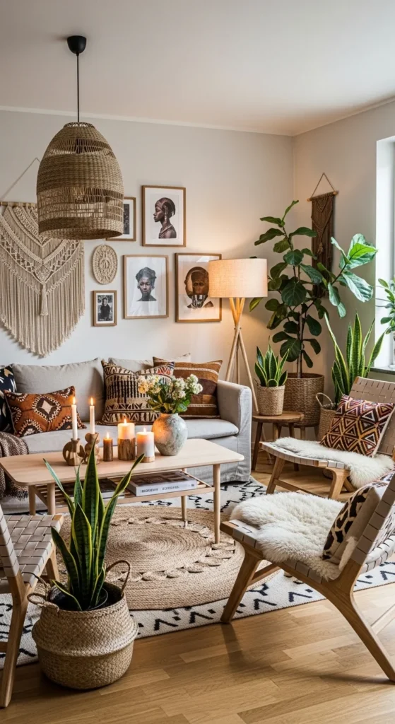 This fusion mixes clean lines with rich texture. Start with Scandinavian basics. Pale wood, simple shapes, neutral walls. Add depth using patterned textiles and handcrafted decor inspired by African design. Keep colors earthy and slightly muted. One or two statement pieces are enough. Cultural texture paired with minimal forms creates a layered but calm interior. Balance is key. Too many bold items shift the look away from modern. Let craftsmanship stand out instead of quantity.