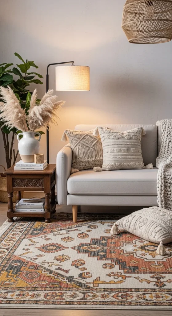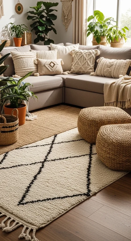 Rug layering brings instant character. Start with a large jute or sisal rug to ground the room. Add a patterned Moroccan or vintage-style rug on top. This trick works well in rentals where floors feel cold or dated. Keep one rug neutral and let the top layer carry pattern. Size matters. The base rug should extend beyond furniture edges. The top rug can sit slightly off-center for a casual look. Shop vintage markets or online resale for unique finds at lower prices. If patterns feel risky, stick to black-and-ivory designs. Layered textures add visual depth without filling the room with extra furniture. This approach also helps define seating zones in open layouts. Rotate rugs occasionally to manage wear and keep things feeling intentional.