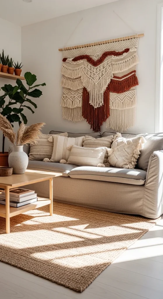 Wall hangings solve the “blank wall” problem without committing to paint or wallpaper. Large woven pieces add softness and absorb visual noise. Choose natural fibers in cream, sand, or clay tones. Hang them slightly lower than framed art to keep the room grounded. This works especially well in rentals. DIY option: mount a textile on a wooden dowel using simple stitching or clips. Textile walls add warmth through texture rather than color. Balance them with clean-lined furniture so the room doesn’t lean overly decorative. Keep nearby decor minimal so the hanging stays the focal point.