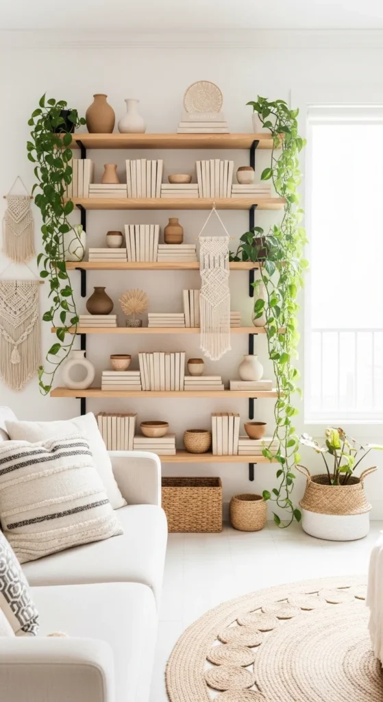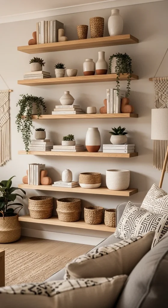 Open shelves work best when styled with restraint. Think fewer items with breathing room. Mix books, plants, and handmade objects for balance. Stack some books horizontally to break repetition. Use baskets for small items that don’t display well. Stick to a limited color range so the shelves feel calm. Avoid filling every inch. Negative space is part of the design. Rotate items seasonally instead of adding more. Curated shelving tells a quiet story without overwhelming the room. Use shelves to echo textures already present, like wood, clay, or woven fibers. This keeps the look cohesive and intentional.