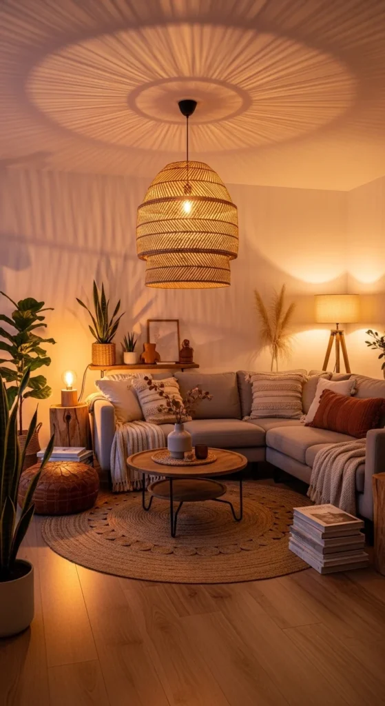 Lighting shapes the mood more than most decor choices. Woven pendants and table lamps cast gentle shadows that feel calm and inviting. Skip harsh ceiling lights when possible. Use layered lighting instead. One overhead woven fixture. One floor lamp near seating. One small table lamp for depth. This setup feels relaxed without feeling dark. Rattan and bamboo shades pair well with neutral walls and wood furniture. Budget tip: swap lampshades instead of buying new lamps. Even a simple base looks boho with the right shade. Warm bulbs matter. Choose soft white over cool tones. Warm lighting sets the emotional tone of the room and supports evening comfort. Place lamps slightly lower than eye level to avoid glare. The result feels intimate and intentional, not staged.