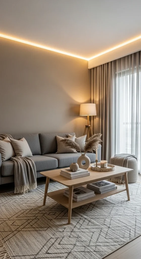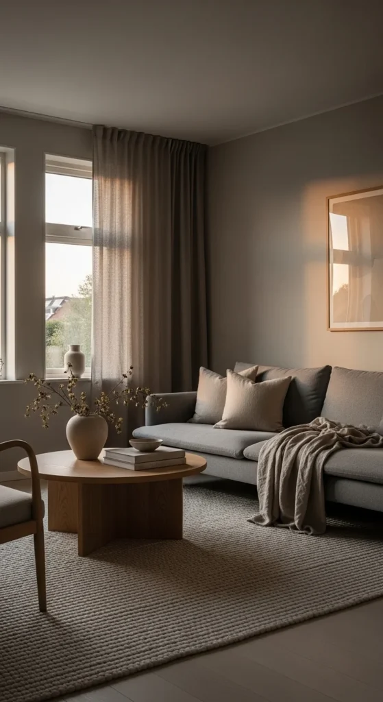 Warm greige walls set the tone without feeling stark. The key is undertone harmony. Test paint swatches morning and evening before committing. Layer textures right after painting. Add a wool or loop-pile rug. Bring in linen cushions. Mix in light oak or ash wood. This stops the room from looking flat.