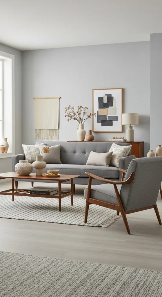 Mid-century shapes bring warmth to grey rooms. Slim legs keep furniture light. This stops grey from feeling heavy. Wood tones should stay warm. Walnut works well.
