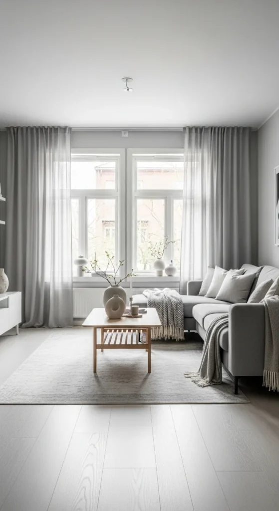 Windows control how grey reads. Treat them carefully. Sheer curtains soften daylight and prevent harsh contrast. Hang rods higher than the frame to stretch wall height visually.