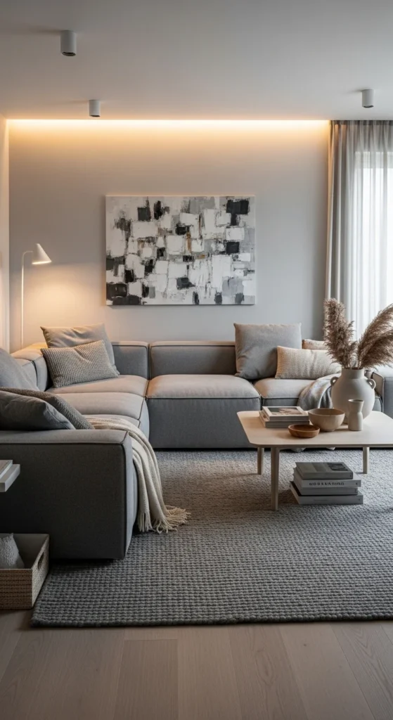 Modular seating suits grey rooms well. It adapts to space and lifestyle. Choose warm grey fabric to avoid a cold look. Keep modules low for openness.