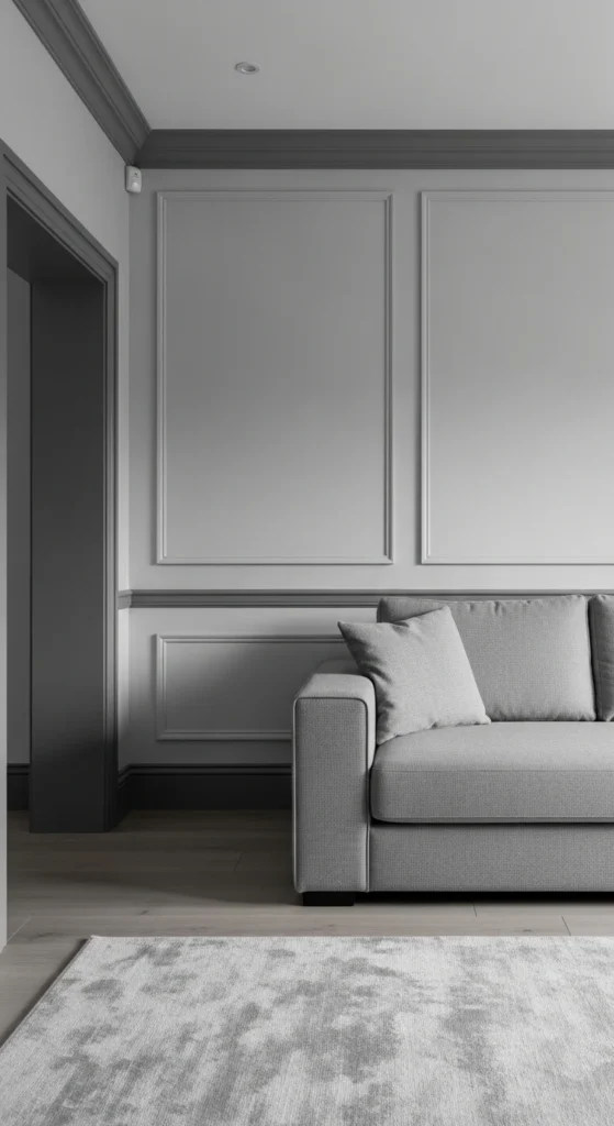 Contrast adds clarity to grey rooms. Trim in a darker shade frames the space. It helps walls feel intentional, not washed out.
