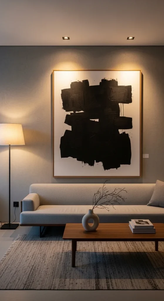 Skip glossy frames. Use black, wood, or canvas edges. Hang art slightly lower than usual so it connects with the sofa. If buying large art feels expensive, DIY canvas pieces with plaster or limewash paint. Texture matters more than detail.