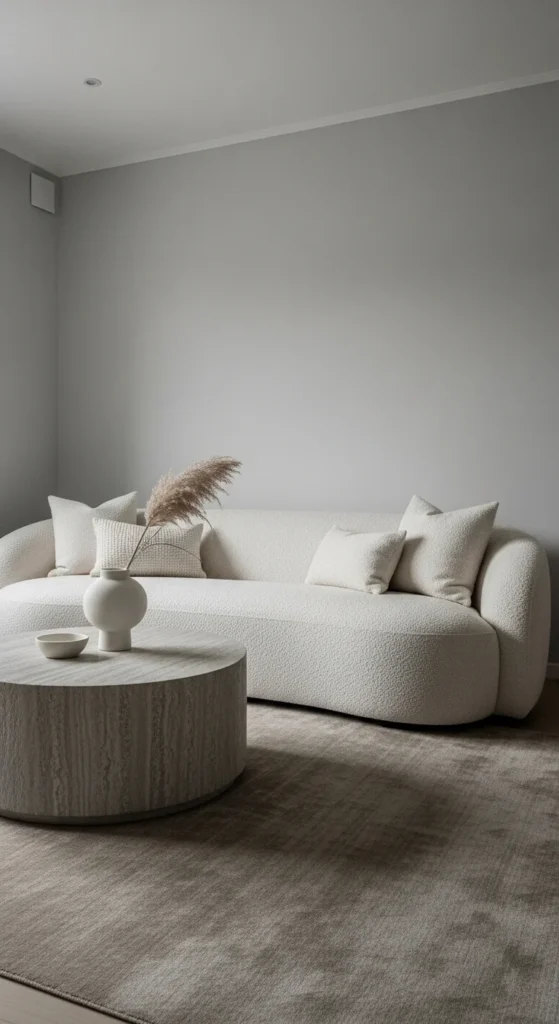 Curves make grey feel welcoming. Straight lines can read stiff. A rounded sofa or barrel chair breaks that up. Bouclé or brushed fabric adds softness without loud color. This works especially well in apartments.