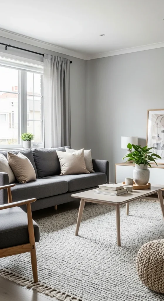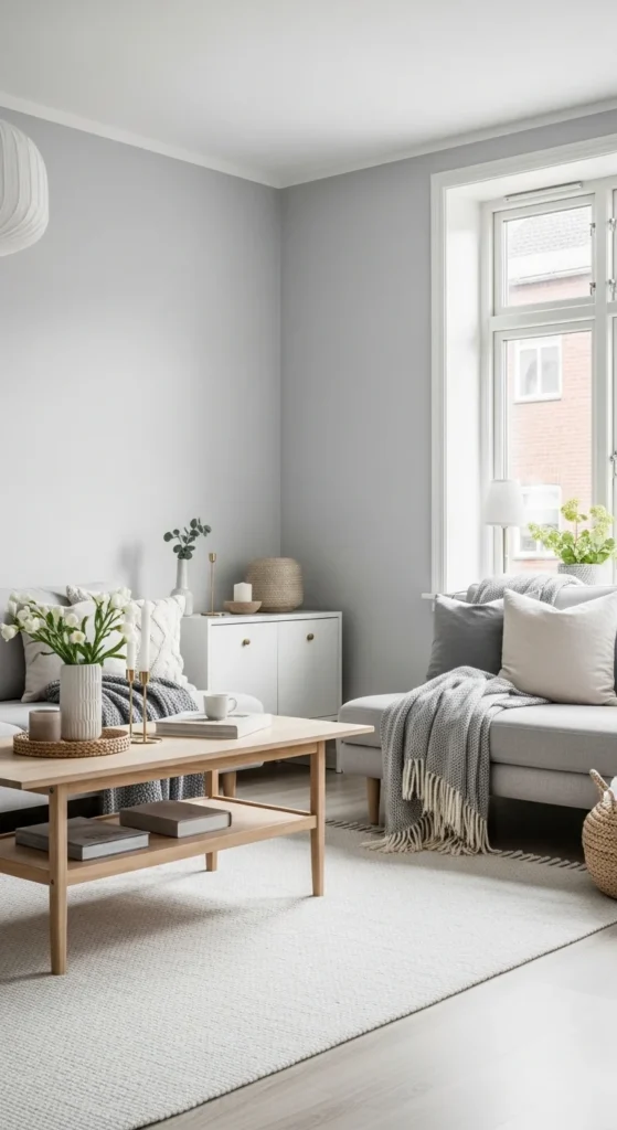 Scandinavian style keeps grey light and livable. Stick to pale greys and simple forms. Low furniture helps the room breathe. Wood should stay light. Birch, pine, or ash work well.
