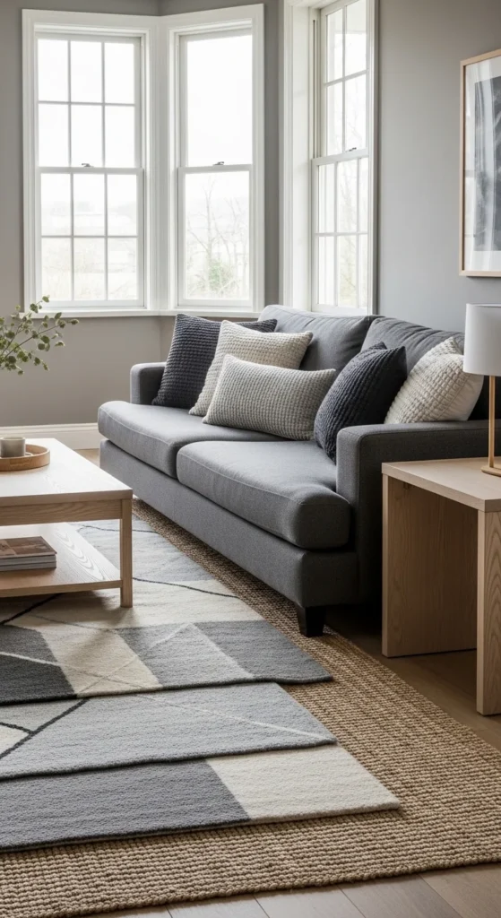 23. Grey Living Room with Layered Rugs