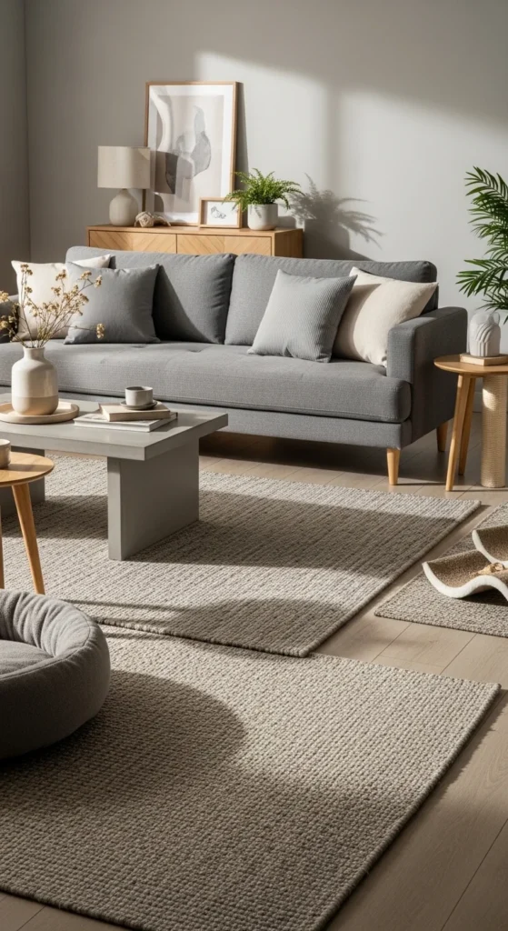 Grey is practical for homes with pets. Choose tight-weave fabrics or performance textiles. They resist stains and hide fur. Wool-blend rugs are easier to maintain than shaggy options.