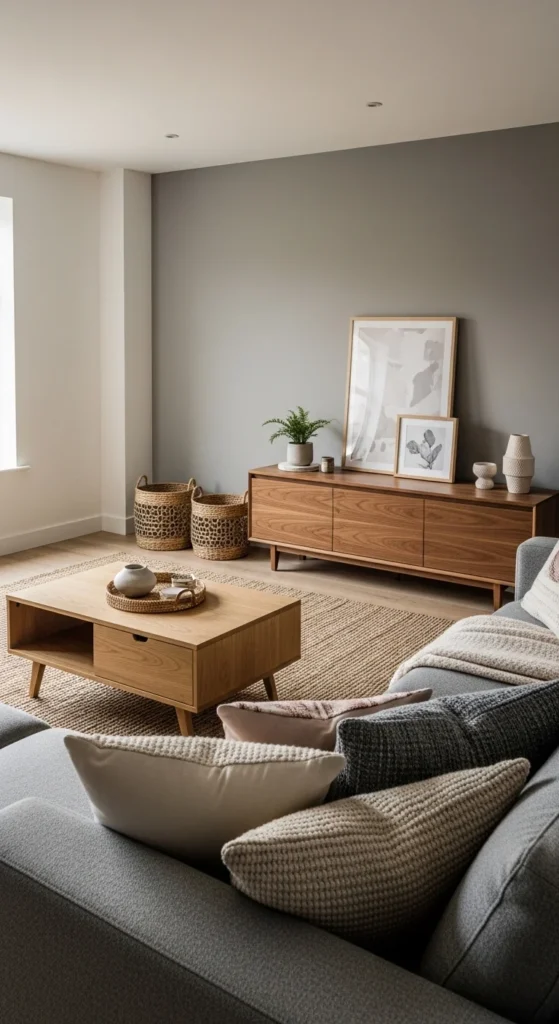 3. Grey and Wood Contrast for a Cozy Modern Look