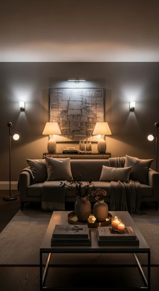 4. Layered Lighting in a Grey Living Room
