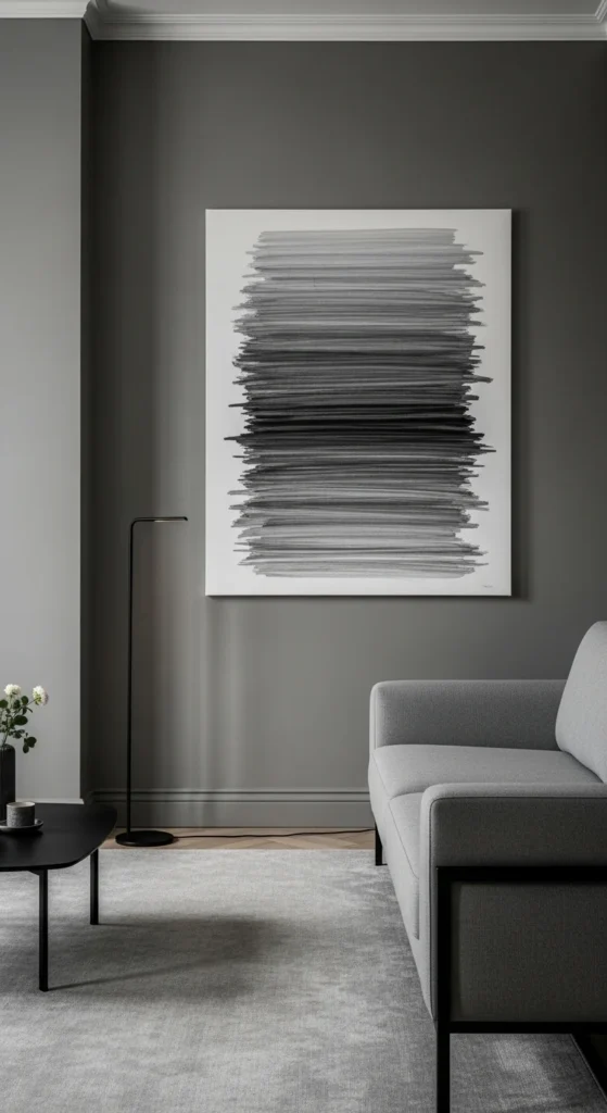 Matte walls change how grey behaves. They absorb light instead of bouncing it. This creates a calmer backdrop. Perfect for living rooms with art. Tonal artwork works best here. Think layers of grey, charcoal, and off-white.