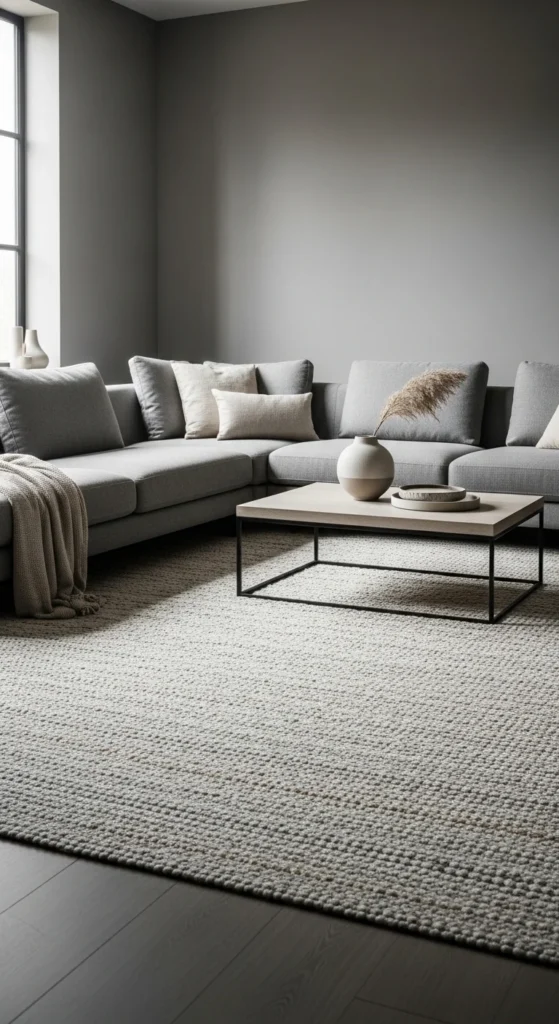 Texture beats color here. Look for wool blends, flatweaves, or subtle patterns. Avoid high contrast prints if the walls are grey. Let the rug add depth instead.