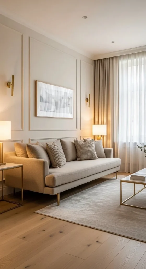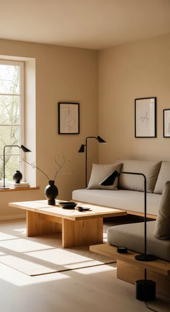 Creamy beige sets a calm foundation that never feels flat. It reads warmer than white and reacts beautifully to daylight. Add soft gold accents through trays, lamps, or thin frame mirrors. This keeps the palette warm without feeling heavy. For budget styling, spray paint old hardware in brushed gold. Stick to linen, cotton, and wool for upholstery. These textures prevent beige from looking washed out. Use darker beige on accent chairs for contrast. Avoid stark chrome here. Wood tones should stay light to medium. Think oak, not walnut. This scheme works well in small rooms because it reflects light while staying cozy. Keep art minimal and abstract for a clean finish.