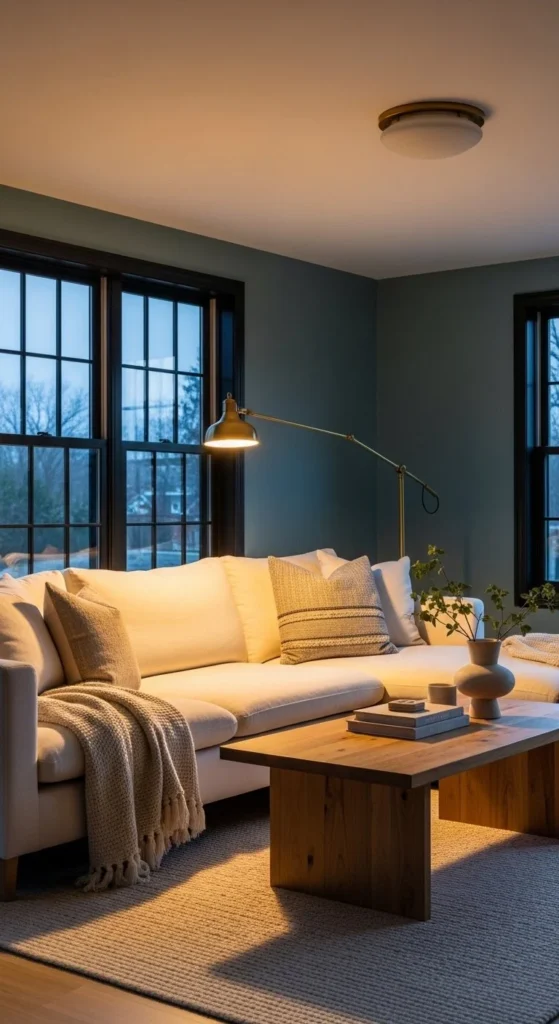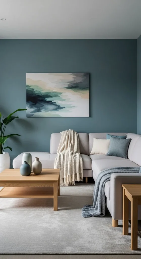 Blue green with gray undertones feels calmer than true blue. It adapts well to changing light. Pair it with soft gray or beige seating. Avoid crisp whites. They feel harsh against this shade. Add texture through rugs and cushions rather than color. DIY tip: paint sample boards and move them around the room during the day. This palette works well in shared living spaces where calm matters.