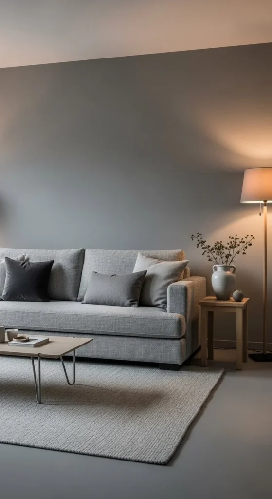 Monochrome gray works when texture does the heavy lifting. Mix light and mid gray shades to avoid flatness. Texture layering keeps the room from feeling cold. Bouclé, wool, and knits work well together. Avoid matching everything exactly. Slight variation feels more natural. DIY option: swap cushion covers instead of furniture. Keep metals muted. Black or brushed steel fits better than shiny chrome. This scheme suits modern apartments where color restraint feels calming.